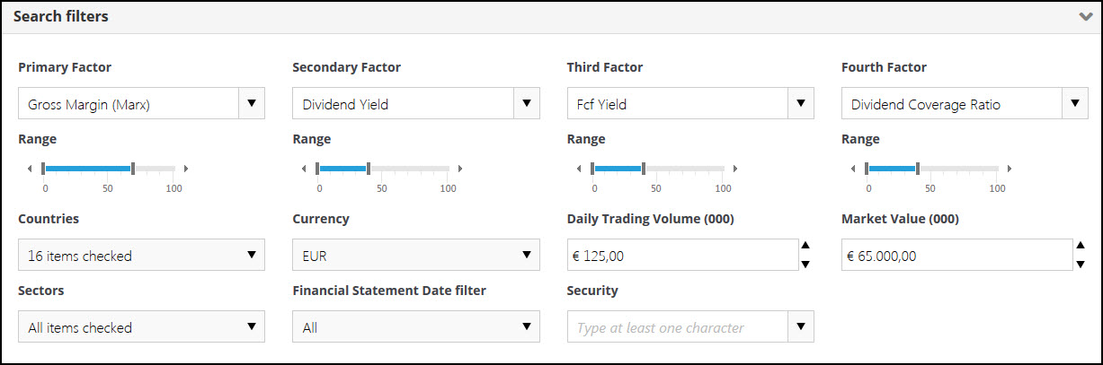 - Selected companies with a daily traded volume of at least €125,000 and a market value larger than €65 million (you must be able to easily buy and sell the shares).
