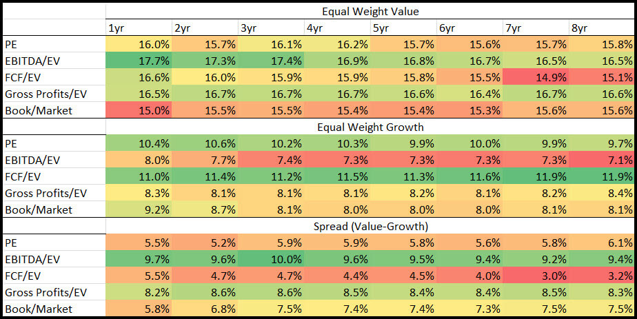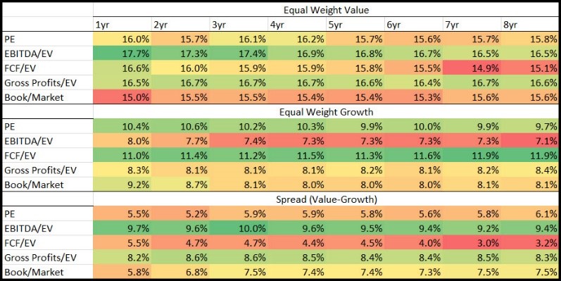The Spread (Value-Growth) part of the table shows the difference between the Equal Weight Value and Equal Weight Growth returns of the two above tables.