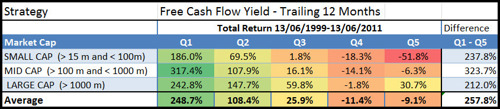 In our book Quantitative Value Investing in Europe: What Works for Achieving Alpha we tested 168 investment strategies in Europe over the 12 year period from June 1999 to June 2011 we also tested 12 months Free Cash Flow yield and 5 year average free cash flow yield.