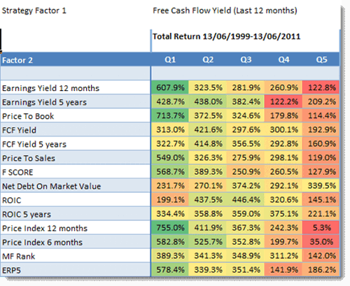 Look at the returns in column Q1, it shows the returns generated by first selecting the 20% best free cash flow yield companies combined with the ratios in the column called Factor 2.
