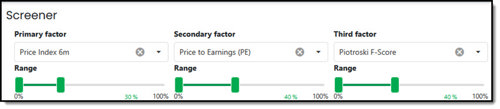 Start simple. Filter for stocks with a 6-month Price Index above 1.25 or just select 0% to 20% with the sliders to get a list of companies with the best momentum. You are confirming the stock is on an upward trend.