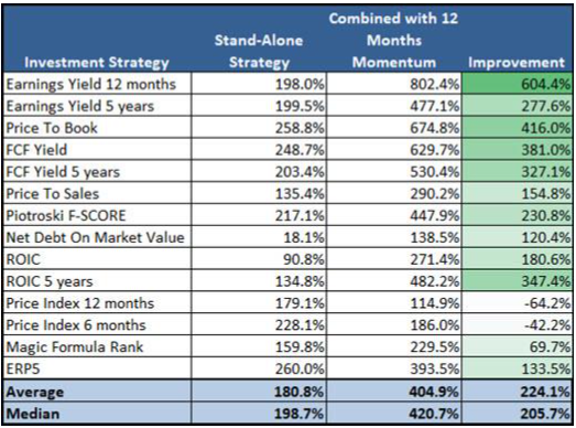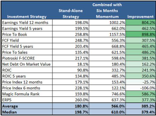 On average, if you combined 6 months' momentum with 13 other investment strategies, your returns would have increased just over 385%.
