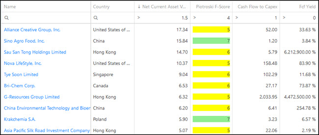 If you use the above list but remove all companies with a Piotroski F-Score of less than 5 (Piotroski F-Score values go from 0 to 9) the list of investment ideas look like this: