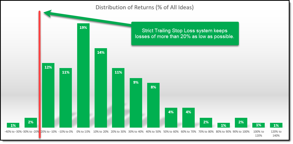 The following chart shows you the returns distribution of all the ideas recommended in the newsletter: